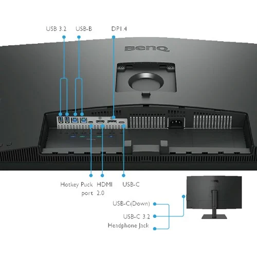 The BenQ PD3205U offers versatile connectivity options including 1x v2.0 HDMI, 1x v1.4 DisplayPort. The integrated USB hub provides 3 USB-A downstream ports and 1.0 USB-C downstream ports for connecting peripherals.